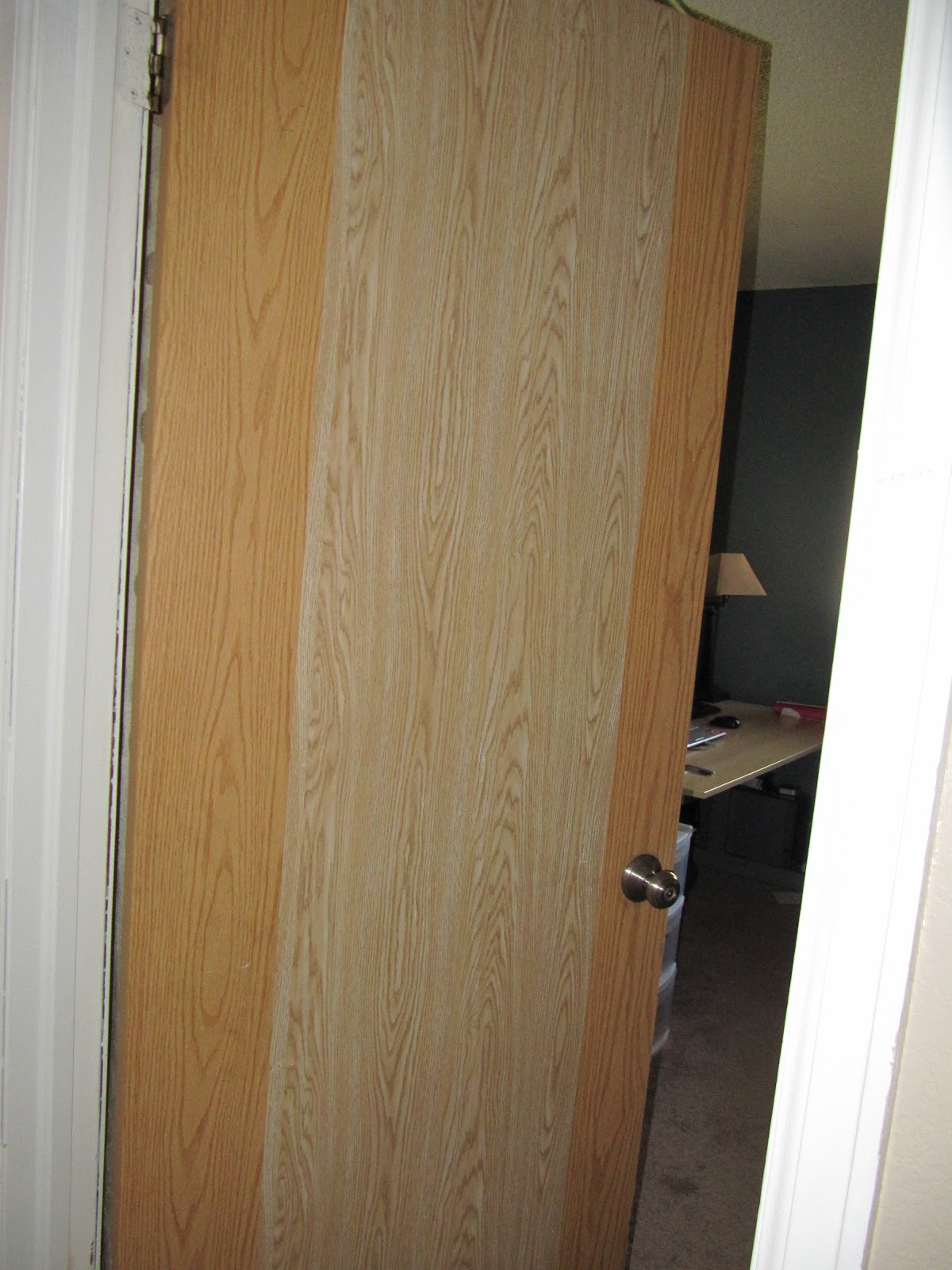 "Fucking Tafoyas" is a common refrain heard in our home. The previous homeowners had some, um, "creative" solutions to issues that they had in the house. When we moved in, the dryer was in the basement, and the washer was one level up, so we hired an electrician to reroute the electrical for the dryer to the laundry room. Then we discovered that the cabinetry above the fridge wasn't hung level, after the new shiny fridge was purchased, and in our kitchen (of course), which meant we had to run out and buy a planer to shave inches off of the bottom of the cabinetry. The latest fun? Replacing all of the interior doors. Not only were they pressed "wood grain" particleboard, but apparently someone in the previous owner's family had a bit of an anger issue - EVERY interior door in the house has a "punch" or a "kick" hole in it (please make punching and kicking motions as you read this. I do). The previous owner's solution wasn't to replace the doors - instead they purchased wood-grain contact paper to cover all the holes. It's pretty hilarious actually, and what's even more hilarious is that we didn't notice the punches or kicks until I was working with the home inspector.