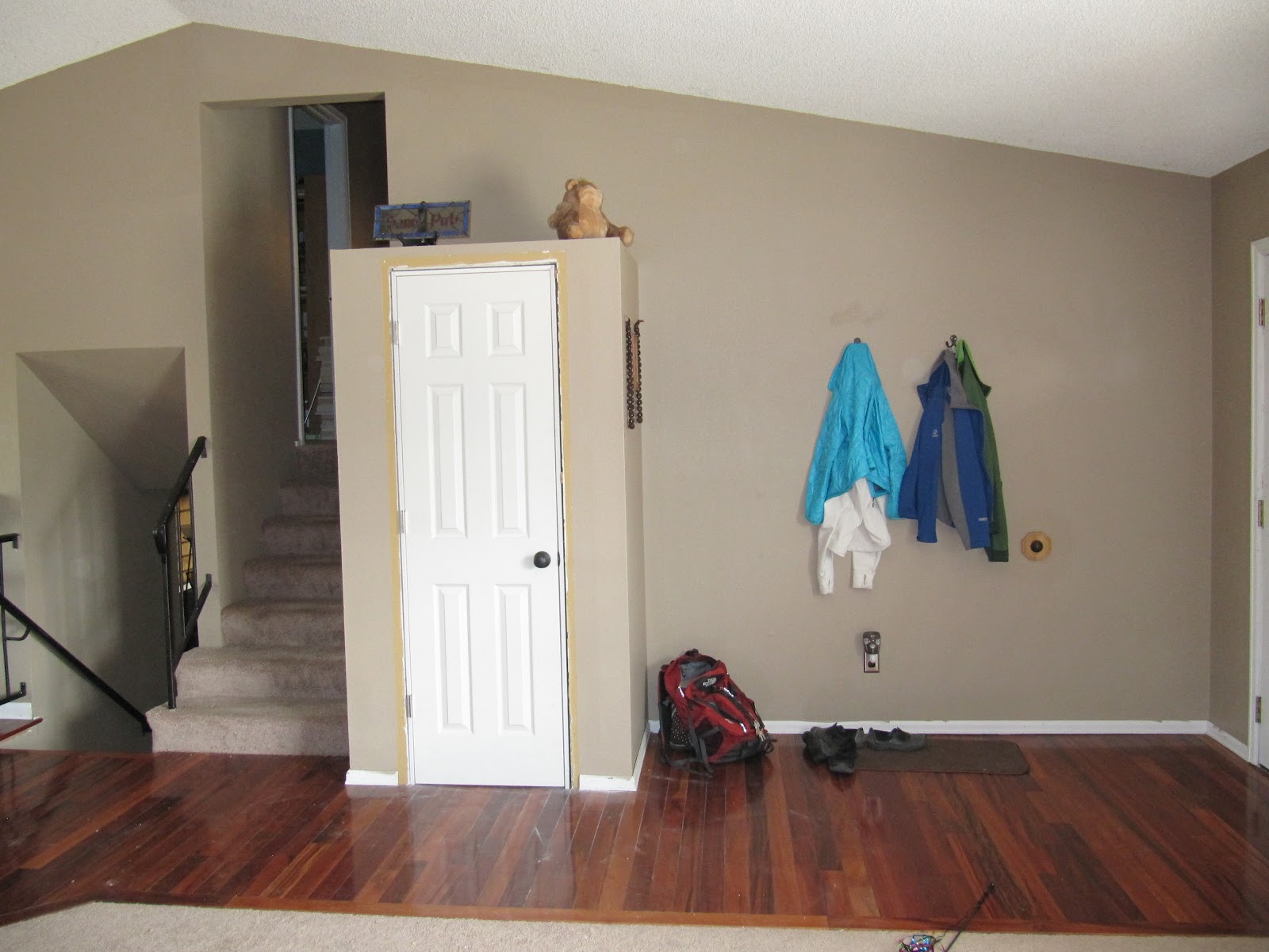 Not the coat closet door, but this fully illustrates the awesomeness of the 80's door with kick-holes in it + wood patterned contact paper = success mantra that the previous owners followed.
